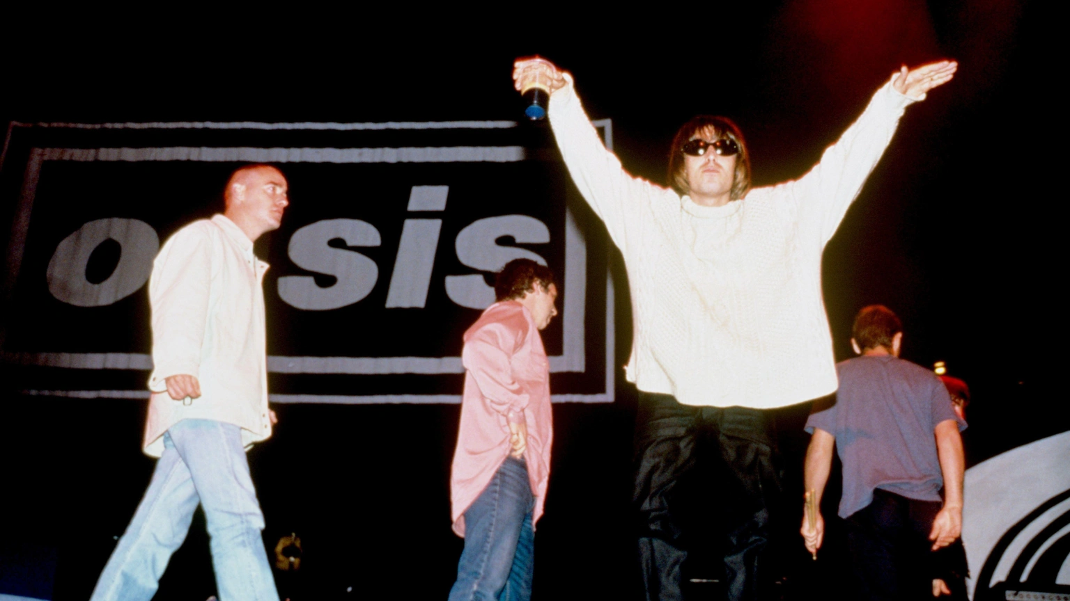 2HBJXHA Oasis singer Liam Gallagher toasts the crowd with a pint of Guinness as fellow band members (l-r) Bonehead (Paul Arthurs), Guigsy (Paul McGuigan), Alan White and Noel Gallagher (mostly hidden) walk off stage